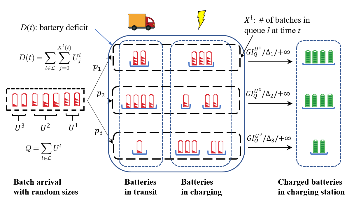发展新能源汽车是我国从汽车大国迈向汽车强国的必由之路,是应对气候变化、推动绿色发展的战略举措。换电模式的电动汽车具有补能时间短、电池充电安全性高等优势,具有广阔的应用前景。然而受限于交通出行需求与城市电网供电能力的不平衡和波动性,目前单站式“分散充电、分散换电”的运营模式面临巨大挑战。张玉利特别研究员团队与合作者针对制约换电模式电动汽车发展的瓶颈难题,在运营模式、模型方法和算法设计等方面开展一系列创新性工作。首先,研究团队提出“集中充电、分散换电”的充换电柔性服务网络运营新模式。通过车电分离、电网交通网解耦,既能有效缓解城市中心电网容量不足、场地成本的运营难题,又能有效解决电动汽车司机排队等待时间长、服务体验差的问题。其次,针对该运营模式,提出了基于队列分解思想的一般批量达到、一般随机服务时间、足够服务台的排队论分析方法,并建立了考虑动力电池充-换-储-运循环过程的两级网络选址-库存模型。最后,针对该非凸非凹离散优化模型的特点,提出了基于次模性(Submodularity)的约束生成-参数搜索(Parametric Search) 精确算法。其计算速度比现有算法和主流商业求解器快1000倍以上。该研究成果推动了随机排队系统分析理论的发展,为企业提供了新的选址和库存管理决策工具。依托新能源汽车国家监测与管理中心平台和出租车运营数据的计算结果表明,随着换电出租车的逐步推广,采用“集中充电、分散换电”模式的方案可将日常运营成本和电池数量降低30%以上,具有良好的应用前景。该成果受到国家自然科学基金项目(71871023,72271029,72061127001)等项目资助。