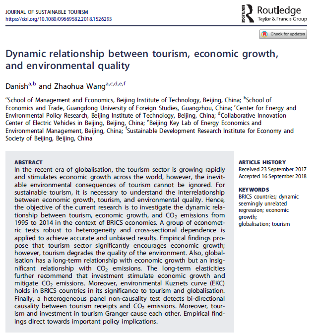 管理与经济学院王兆华教授领衔的团队研究成果 “旅游、经济与环境质量的动态关系”(Dynamic Relationship Betwee...