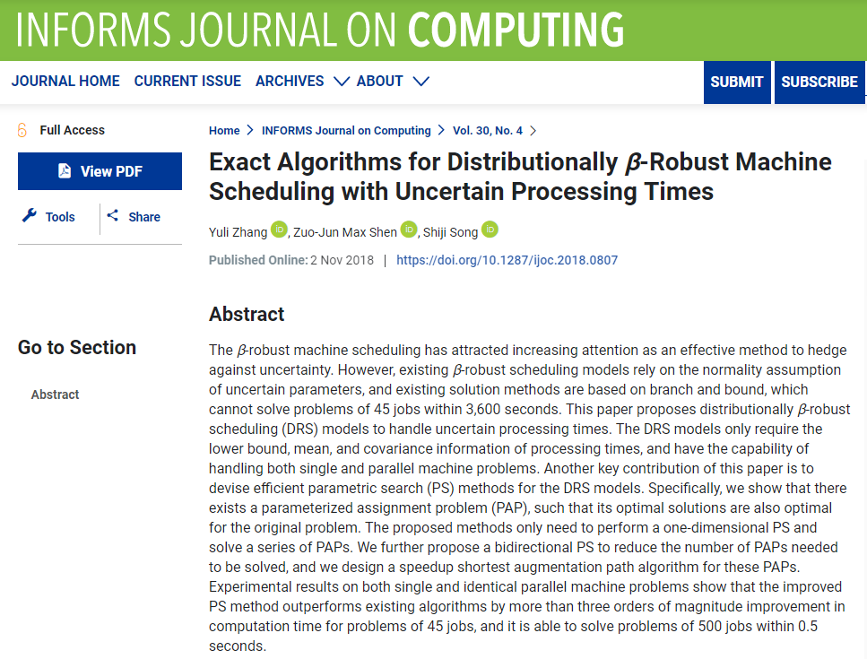 公司教师张玉利与美国加州大学伯克利分校申作军教授、清华大学宋士吉教授合作的研究成果“Exact Algorithms for Dist...