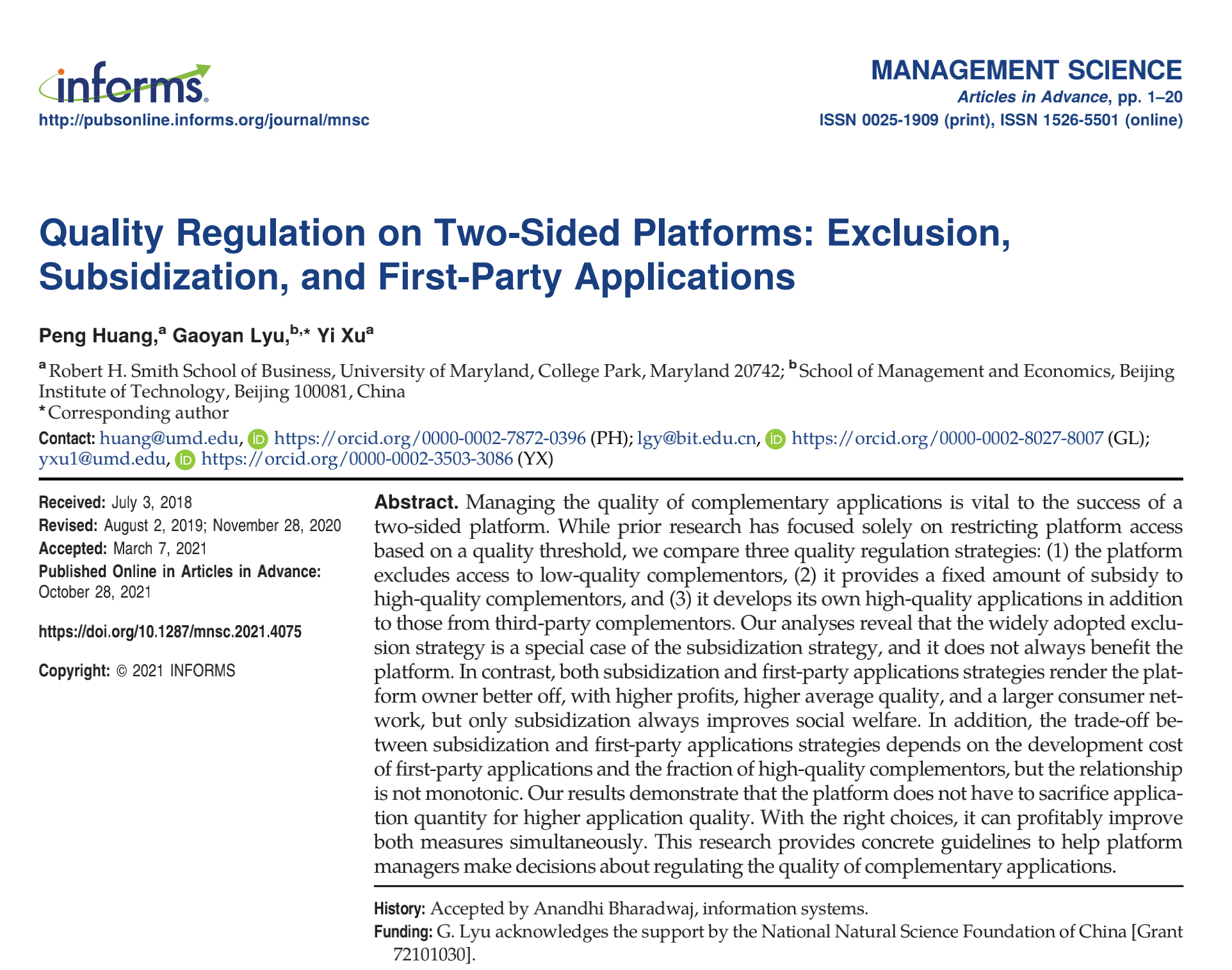 近日,公司管理科学与物流系吕高燕老师与美国马里兰大学的合作者Peng Huang教授,Yi Xu教授在管理学UTD期刊Management Science发表题为“Quality Regulation on Two-Sided platforms: Exclusion, Subsidization, and First-Party Applications”的研究论文。