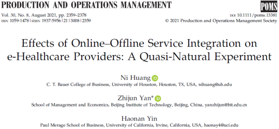 近日,永利官网管理与经济学院颜志军教授团队在在线医疗服务领域取得重要研究进展,其研究成果《Effects of Online–Offline Service Integration on e-Healthcare Providers: A Quasi-Natural Experiment》以开篇文章(LeadArticle)的形式发表在管理科学国际顶级期刊《Production and Operations Management》2021年第8期,该研究首次在在线医疗领域探索了线上线下渠道整合的影响,验证了线上线下渠道整合对不同类型医生的异质性作用。该项研究工作由颜志军教授团队和美国休斯顿大学NiHuang教授合作完成。