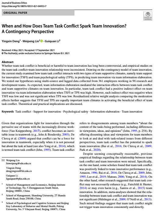 Deng, Y., Lin, W., & Li, G. (2021). When and how does team task conflict spark team innovation? A contingency perspective.Journal of Business Ethics. Advance online publication.https://doi.org/10.1007/s10551-021-04953-7