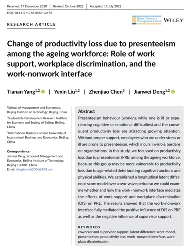 Yang T A, Liu Y X, Chen Z J, Deng J W. Change of productivity loss due to presenteeism among the ageing workforce: Role of work support, workplace discrimination, and the work-nonwork interface[J]. Human Resource Management Journal, 2022. https://doi.org/10.1111/1748-8583.12475